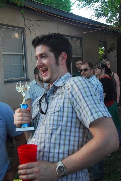 Here we see this happy man at the outdoor party has won a gleaming trophy for himself.