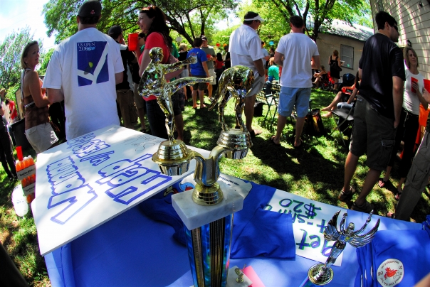 Blue signs and big golden trophies sit on tables and people rallying for money.