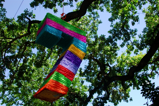 A bright and multicolored number seven hangs from a tree branch on a sunny day.