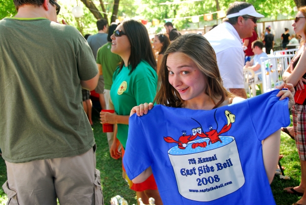 A teenage girl proudly shows off her new, blue t-shirt commemorating the 2008 East Side Lobster Boil.