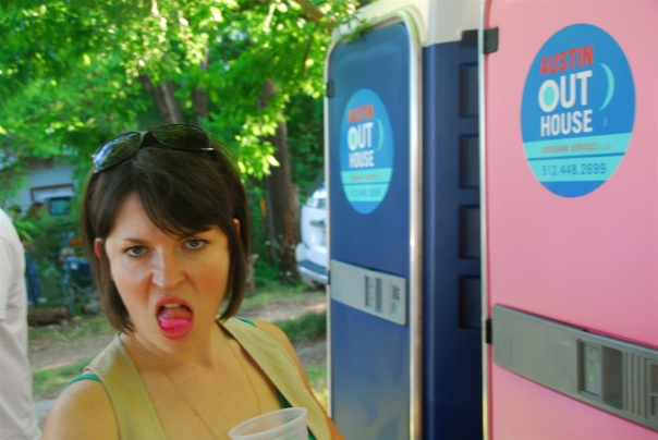 This annoying woman is about to enter a pink portable toilet in Austin, Texas.