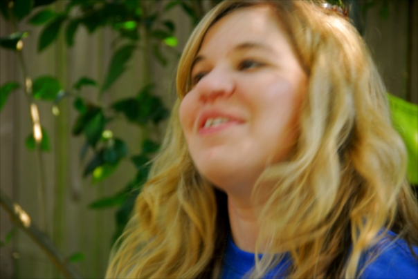 The woman is enjoying her time outdoors and laughing during the picture.