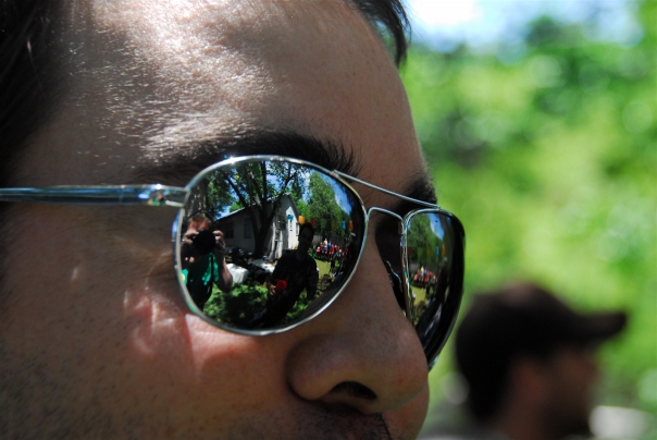 A close up of a man in sunglasses with the reflective view of the cameraman and a small trailerhome