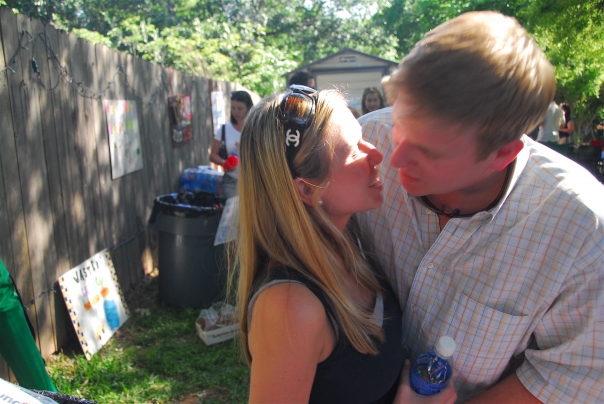 A blond couple is leaning in for an awkward kiss, in front of some type of yard gathering.