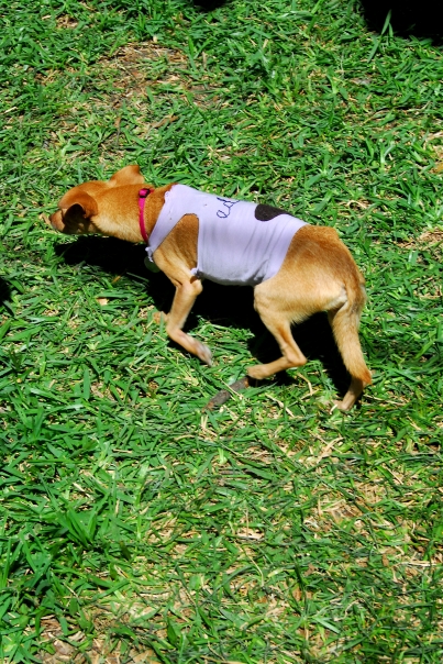 The brown dog is walking on the green grass and is wearing a shirt.