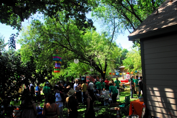 A get together party in the backyard with the people surrounding the pinata.