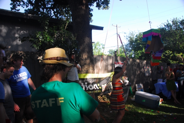 a girl hitting a pinata outdoors at a party with coolers and tables in the background.