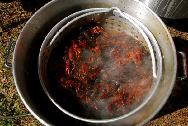 A fully cooked pot of delicious crayfish sitting on the ground outside on a sunny day.