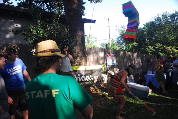 It looks like a party where there is a girl hitting a pinata.