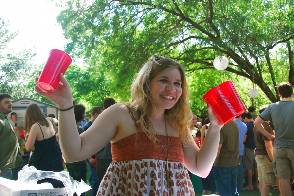 The smiling proud lady who wore a sun dress held up three red plastic cups.
