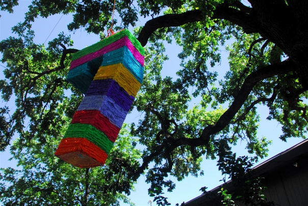 A colorful pinata in the shape of the number seven hangs from a tree branch on a sunny day.