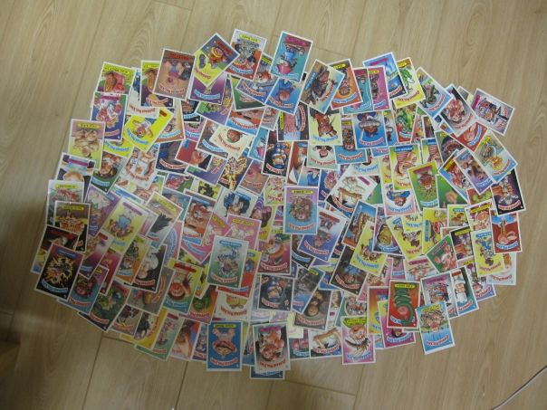 Several cards with pictures on them spread out on a light brown wooden floor.