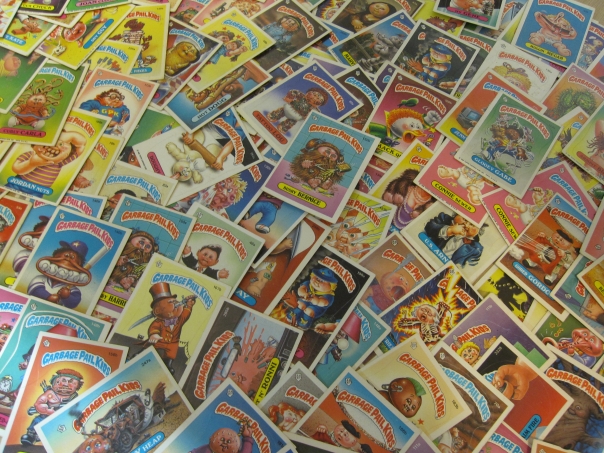 Hundreds of garbage pail kids trading cards are shown in a pile.