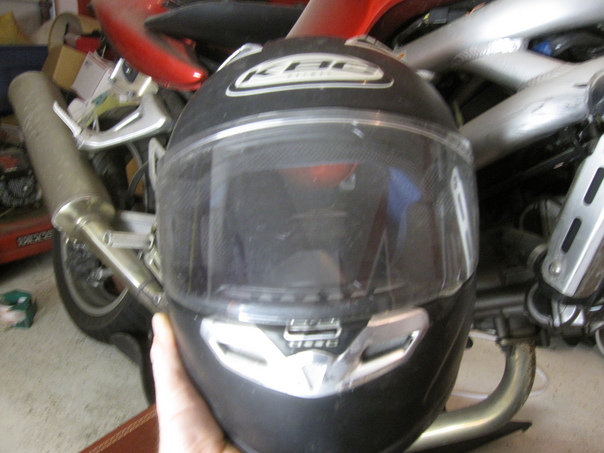 Guy showing his helmet.