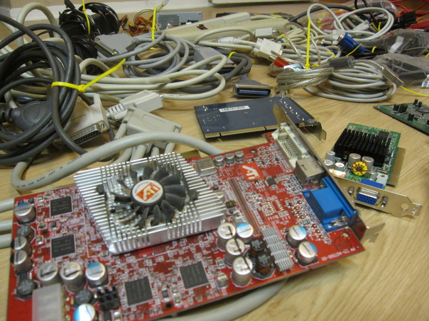 An assortment of multi colored computer components rest on the wood table top.