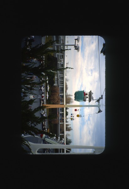 In the air we can see gondulas gliding along, with a few clouds in the sky. |