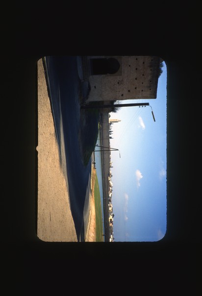 entrance arch,river,lamp post, and buildings seen |