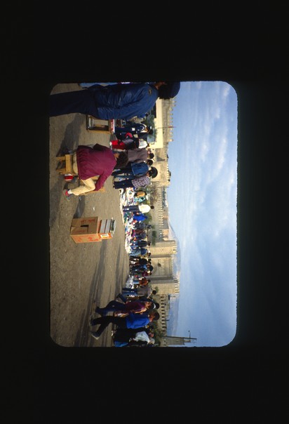a man is wearing maroon jacket and sitting on a small stool and many people are in the road. |