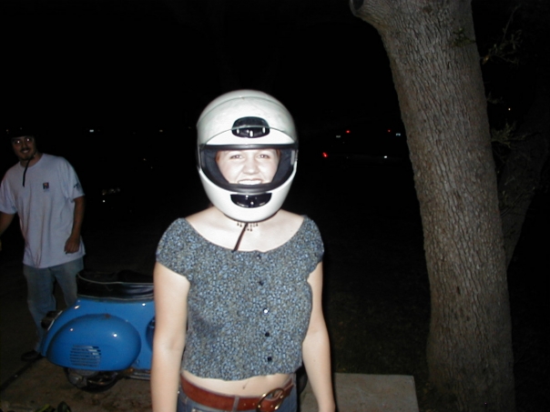 Late at night, man in white tee shirt and jeans (seems he may be wearing glasses and a chin strap that would indicate a helmet. In fron of him is the rear of a blue scooter. In the foreground is a woman, moderate height, wearing a small shirt, almost sleeveless; cuts off at her stomach, inches above a auburn colored belt. She wears a white helmet that encompasses most of her head; the windshield appears to be up. And there is a medium sized tree to the right of the image.