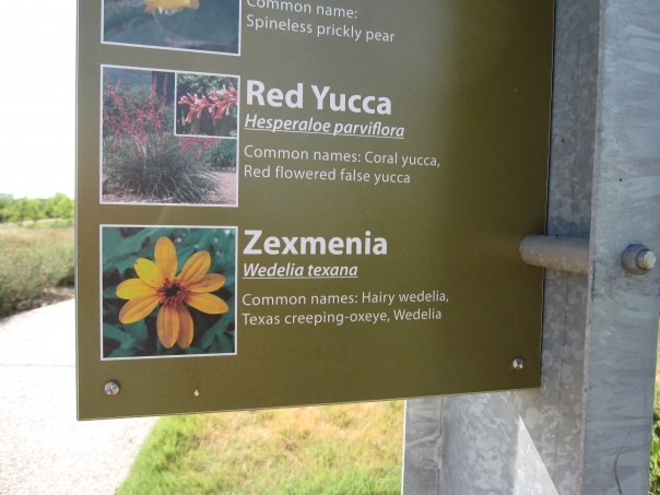 This sign is identifying several types of flowers at an area next to a park.
