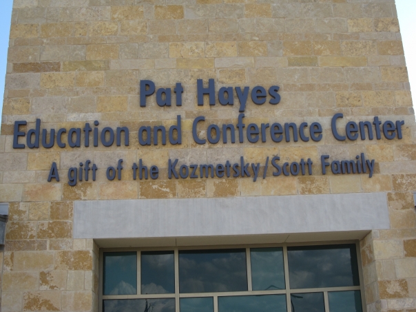 The front door of a stone façade building, blue lettering reads "Pat Hayes Education and Conference Center: A gift of the Kozmetsky/Scott Family".