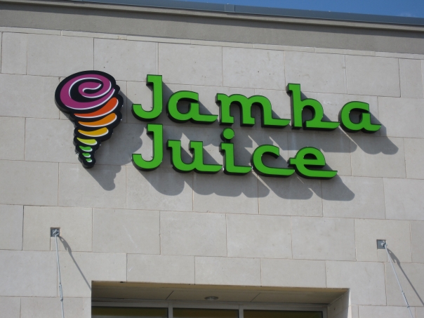 A sign for Jamba Juice in neon green, with a swirled multicolored logo to the left of it, installed on the wall above the entrance door.