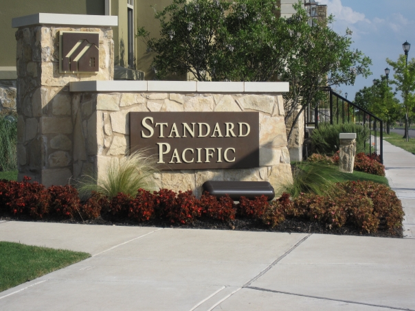 A sign sits on a brick wall that reads Standard Pacific near a small building surrounded by red and green bushes.