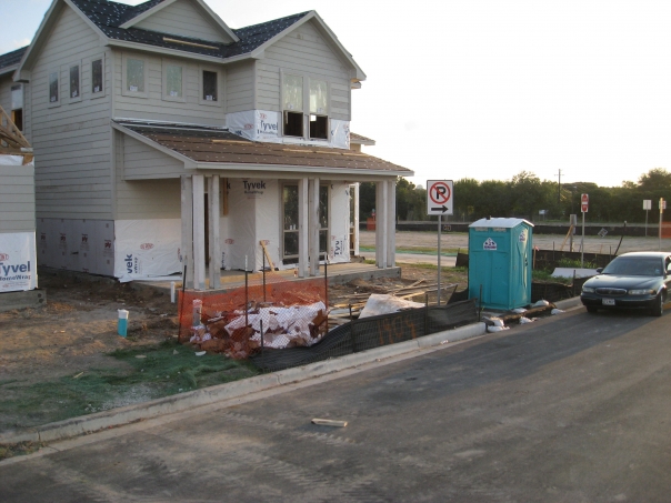 new construction house on a corner lot with a blue portapotty and a green car parked in front. Don't overlook the no parking sigh! Two story framed house on a corner lot. Home is about 75% sided with beige vinyl siding. There ia one set of tall double hung twin windows in the front first story wall of the home. The entry door is not in view from the angle. There are six white columns across the front of the porch that is approximately 8" off the ground. The home has 6 smaller single hung windows in the second story as well as a set of twin double hung windows in the front wall of the second story. There is orange vinyl construction fencing to the right of the home surrounding building debris. There is a blue/green porta-potty in front of the house beside a no parking sign. There is also a dark newer model car parked in front of the house. The home appears to be sitting beside a garage or similar home also under construction. |