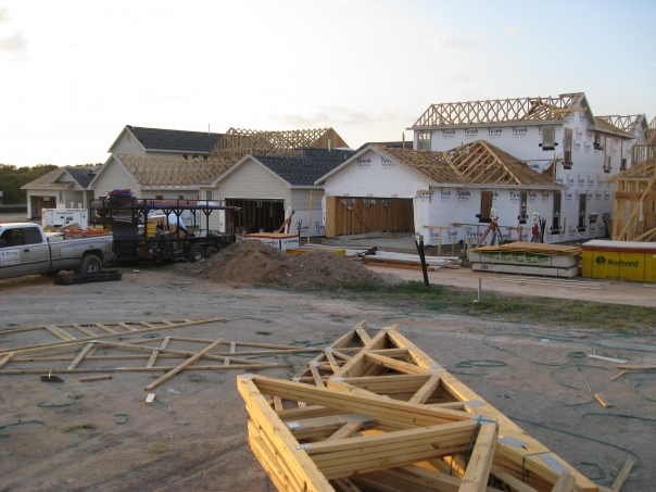 Wooden, pre-made trusses are neatly stacked on the dusty pavement.