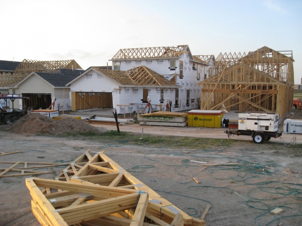 a housing development with house frames and unfinihsed homes and wood pieces and piles of dirt and other housing materials