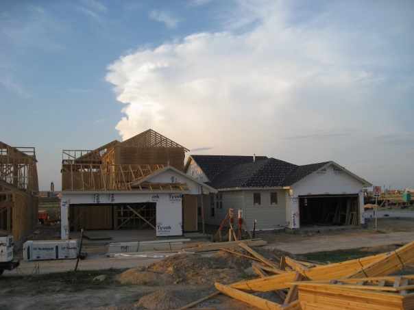 new development house in a tightly packed neighborhood