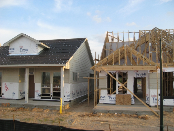 building construction. houses crammed together in a new neighborhood or something.