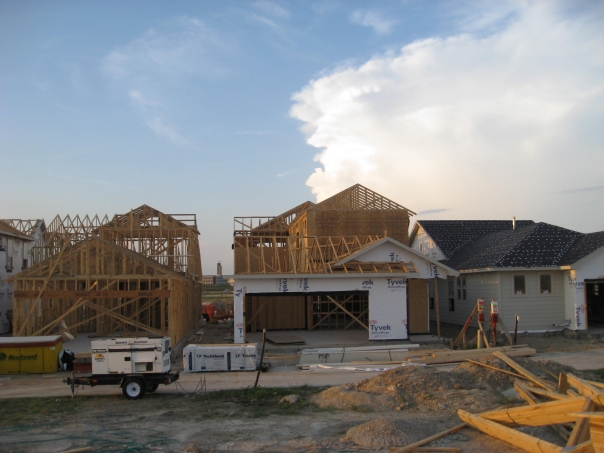 A picture of half-finished garages, framed in, in the midst of construction of new residences.