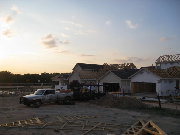 A pickup truck is parked on the dirt in front of several homes that are under construction in a community development.