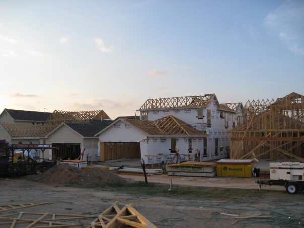 A construction site with uncompleted identical single family homes in a suburban neighborhood