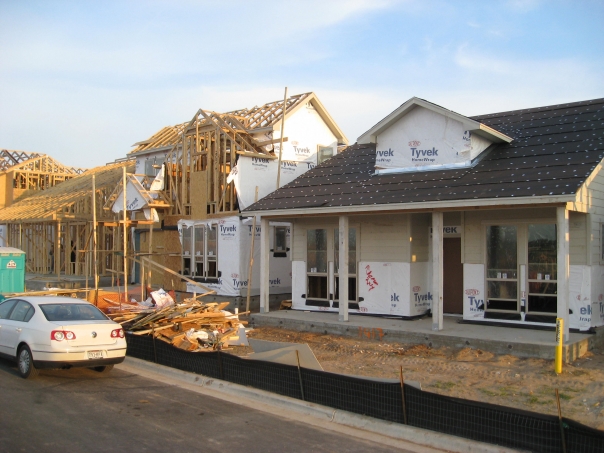 Two new homes under construction using Tyvek housing wrap and landscaping still needs to be completed.