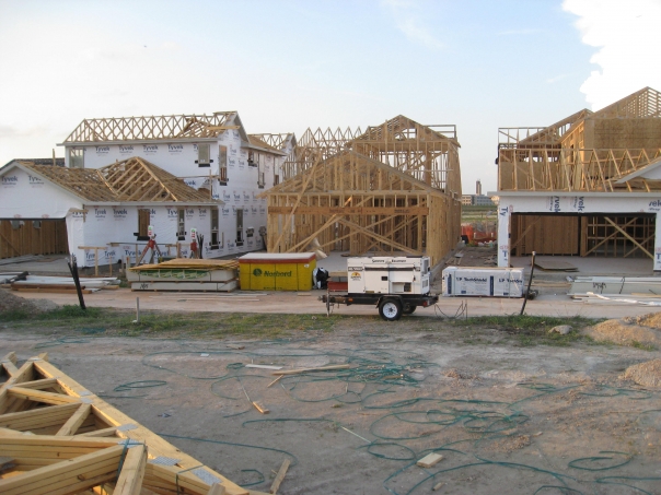 The construction site is building a lot of new homes togetherv