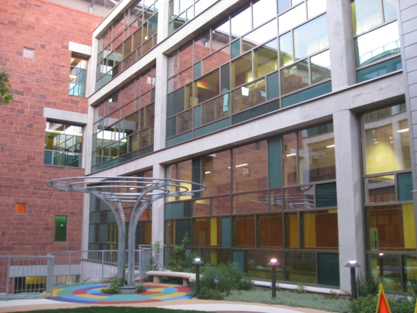 A three story building with multicolored windows, and a brick wing adjacent, overlook a metal sculpture in the courtyard.