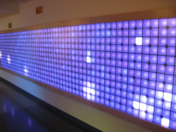 A large array of blueish purple lights with seemingly random patterns of white