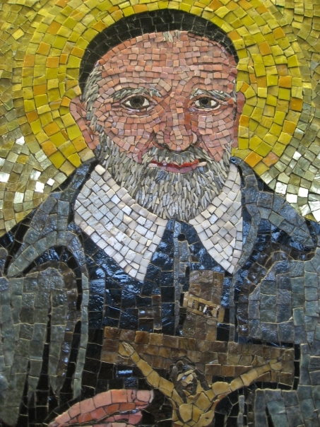 Mosiac image of a Saint with grey beard and pointing at Christ on the cross. Very nice colors. Saint looks friendly.