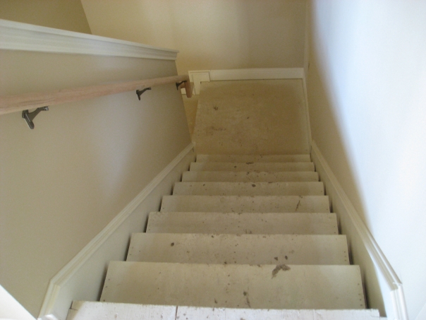 The dimply lit stairwell has a wood hand rail and nasty carpet.