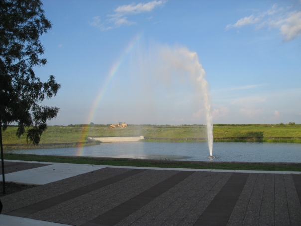 A shooting waterspout in a pond makes a small beautiful rainbow.