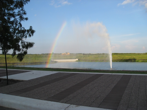 There is a fountain in the middle of the pond and the spray from it created a rainbow.