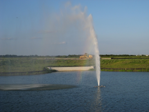 some type of water sprout shoots out in a lake as construction vehicles move in the background.