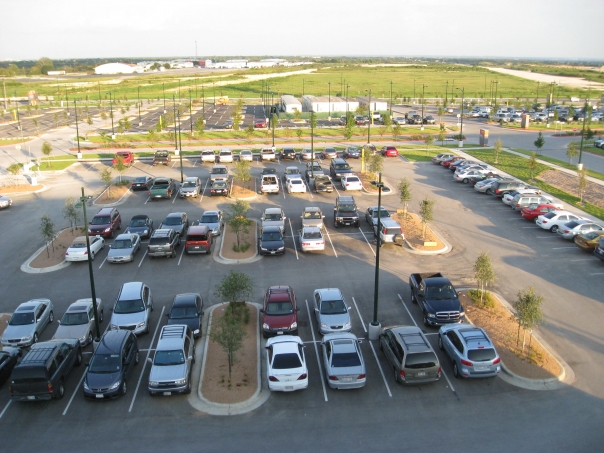 The aerial view of this amusement park parking lot, shows multi colored cars of many people who have already arrived for today's fun this early morning.
