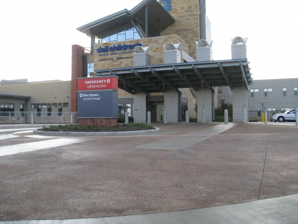 picture of dell children's hospital's main entrance and the sign telling where the emergency entrance is