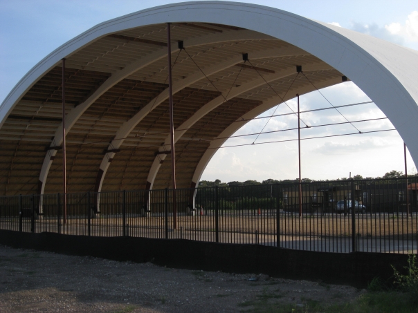 An arched gazebo with a stage underneath it and a wrought iron fence around it.