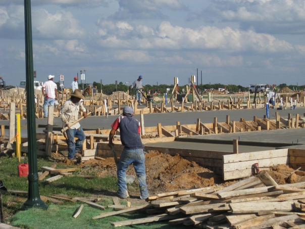 These construction workers recently finished pouring concrete for the foundation a new building.