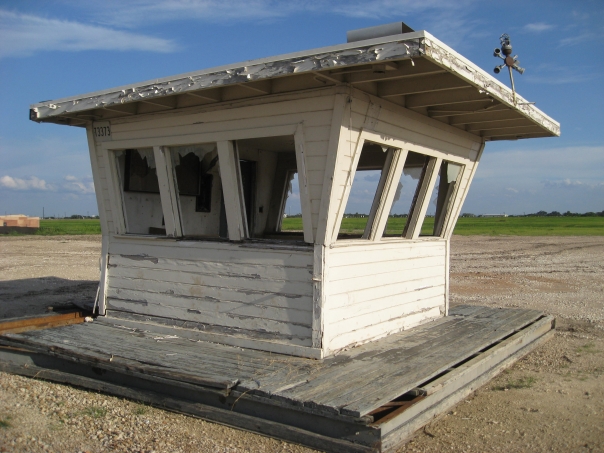 A monitoring station with worn paint and missing windows with a green field behind it on a sunny day