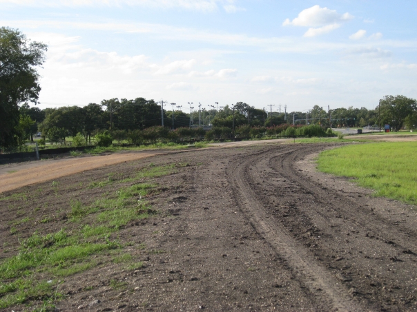 Sparse grass is visible amidst a dirt track showing tire marks alongside a more solid field.